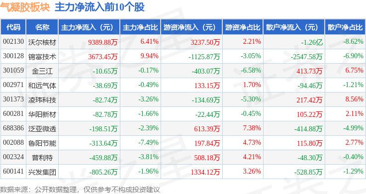 从资金流向上来看,当日气凝胶板块主力资金净流出1.05亿元,游资资金净流入1347.69万元,散户资金净流入9149.26万元。气凝胶板块个股资金流向见下表: