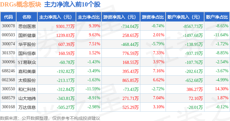 从资金流向上来看,当日DRGs概念板块主力资金净流出1.38亿元,游资资金净流入5677.16万元,散户资金净流入8151.85万元。DRGs概念板块个股资金流向见下表:
