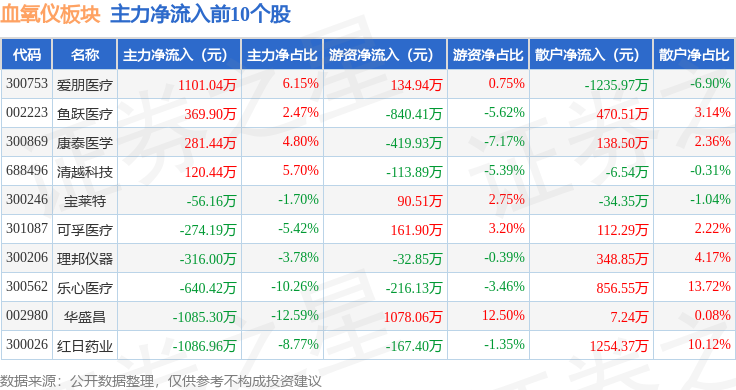 从资金流向上来看,当日血氧仪板块主力资金净流出1.14亿元,游资资金净流入3408.72万元,散户资金净流入7969.83万元。血氧仪板块个股资金流向见下表: