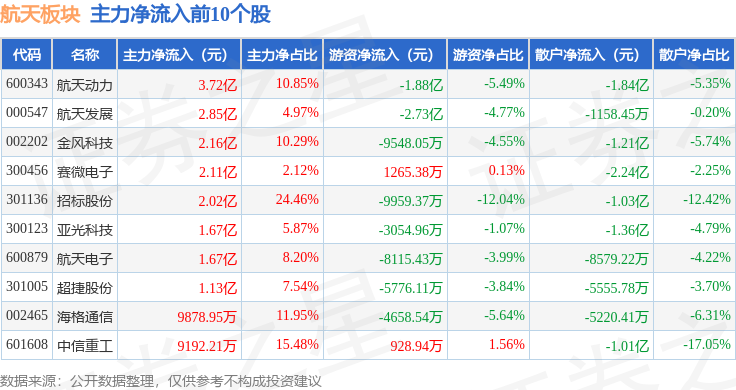 从资金流向上来看,当日航天板块主力资金净流出5.27亿元,游资资金净流出7.89亿元,散户资金净流入13.16亿元。航天板块个股资金流向见下表: