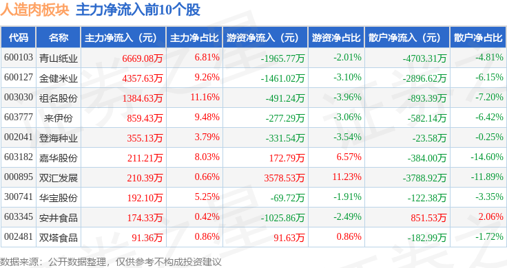 从资金流向上来看,当日人造肉板块主力资金净流出1.88亿元,游资资金净流入7512.72万元,散户资金净流入1.13亿元。人造肉板块个股资金流向见下表: