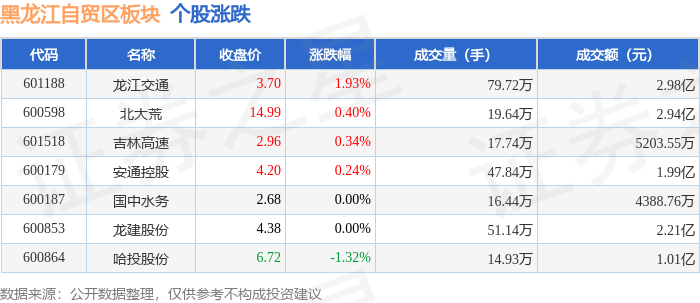 从资金流向上来看,当日黑龙江自贸区板块主力资金净流出7656.86万元,游资资金净流入550.8万元,散户资金净流入7106.06万元。黑龙江自贸区板块个股资金流向见下表: