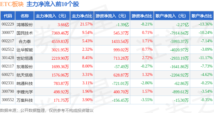 从资金流向上来看,当日ETC板块主力资金净流出4.83亿元,游资资金净流入3921.19万元,散户资金净流入4.44亿元。ETC板块个股资金流向见下表: