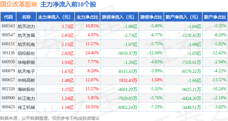 从资金流向上来看,当日国企改革板块主力资金净流出70.65亿元,游资资金净流出3.58亿元,散户资金净流入74.23亿元。国企改革板块个股资金流向见下表:
