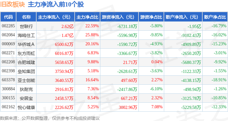 从资金流向上来看,当日旧改板块主力资金净流入4718.87万元,游资资金净流出5563.82万元,散户资金净流入844.94万元。旧改板块个股资金流向见下表: