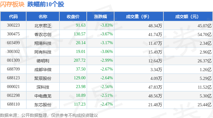 证券之星消息,12月2日闪存板块较上一交易日下跌1.56%,北京君正领跌。当日上证指数报收于3897.71,下跌0.42%。深证成指报收于13056.7,下跌0.68%。闪存板块个股涨跌见下表: