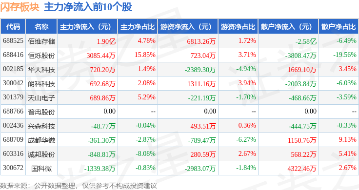 从资金流向上来看,当日闪存板块主力资金净流出45.38亿元,游资资金净流入6.64亿元,散户资金净流入38.74亿元。闪存板块个股资金流向见下表: