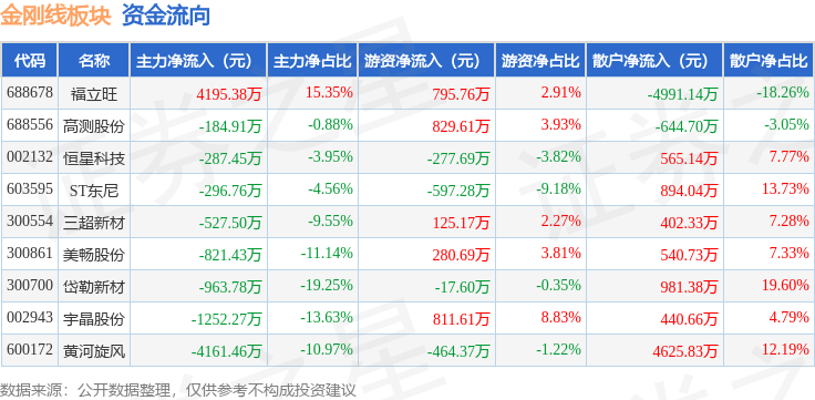 从资金流向上来看,当日金刚线板块主力资金净流出4300.19万元,游资资金净流入1485.91万元,散户资金净流入2814.28万元。金刚线板块个股资金流向见下表: