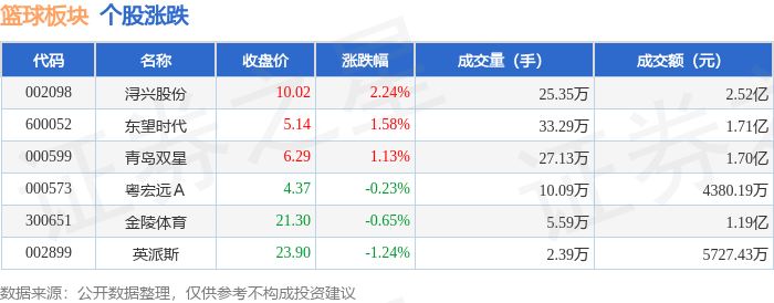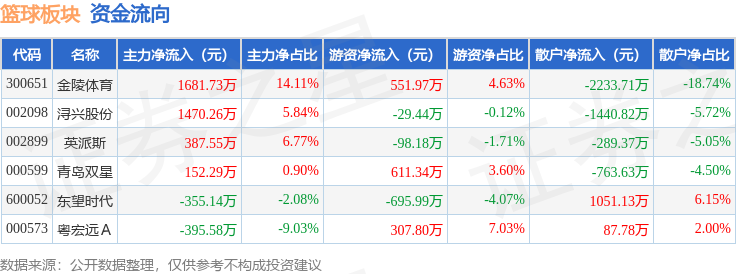 从资金流向上来看,当日篮球板块主力资金净流入2941.12万元,游资资金净流入647.49万元,散户资金净流出3588.6万元。篮球板块个股资金流向见下表: