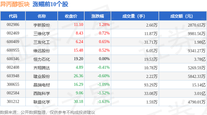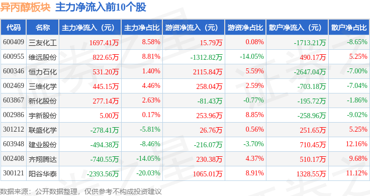 从资金流向上来看,当日异丙醇板块主力资金净流出2.71亿元,游资资金净流入6325.41万元,散户资金净流入2.08亿元。异丙醇板块个股资金流向见下表: