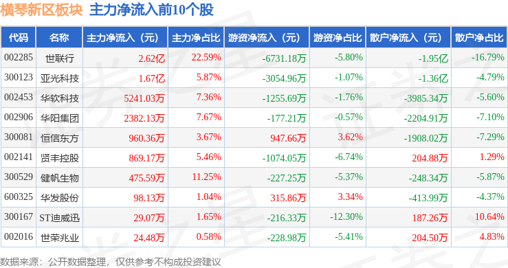 从资金流向上来看,当日横琴新区板块主力资金净流入3.52亿元,游资资金净流出1.38亿元,散户资金净流出2.14亿元。横琴新区板块个股资金流向见下表: