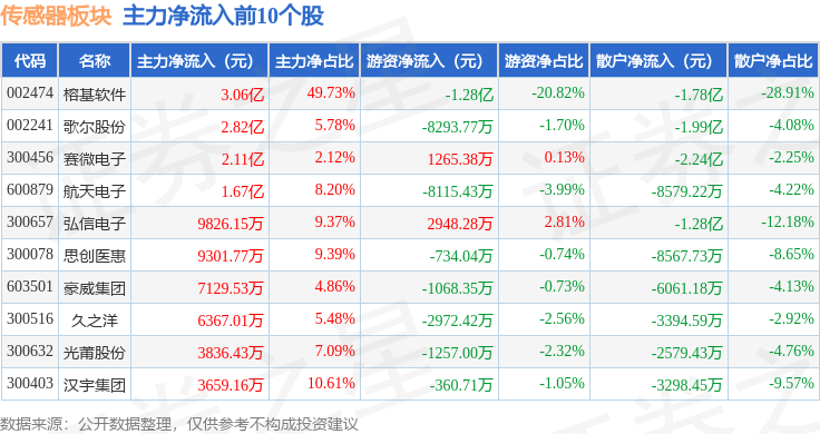从资金流向上来看,当日传感器板块主力资金净流出19.38亿元,游资资金净流入4.39亿元,散户资金净流入14.99亿元。传感器板块个股资金流向见下表: