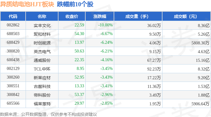 证券之星消息,12月2日异质结电池HJT板块较上一交易日下跌1.82%,实丰文化领跌。当日上证指数报收于3897.71,下跌0.42%。深证成指报收于13056.7,下跌0.68%。异质结电池HJT板块个股涨跌见下表: