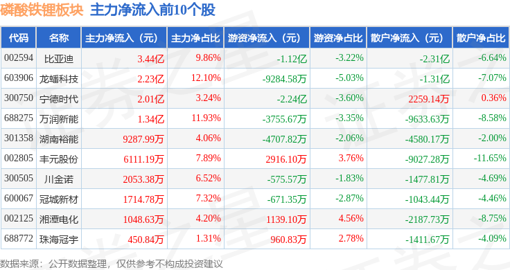从资金流向上来看,当日磷酸铁锂板块主力资金净流出12.95亿元,游资资金净流出2.77亿元,散户资金净流入15.71亿元。磷酸铁锂板块个股资金流向见下表: