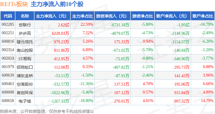 从资金流向上来看,当日REITs板块主力资金净流出2.22亿元,游资资金净流入2197.03万元,散户资金净流入2.0亿元。REITs板块个股资金流向见下表: