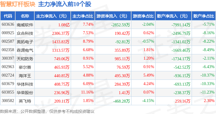 从资金流向上来看,当日智慧灯杆板块主力资金净流出4.96亿元,游资资金净流入7098.5万元,散户资金净流入4.25亿元。智慧灯杆板块个股资金流向见下表: