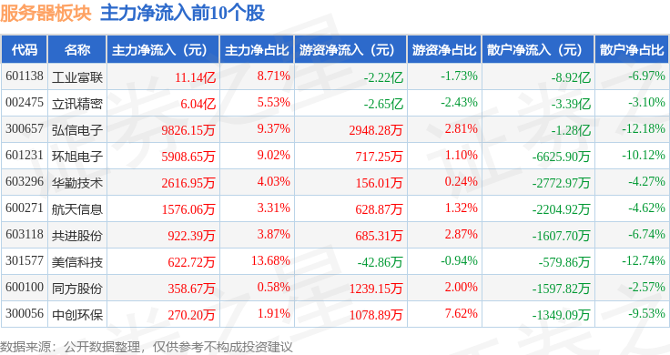 从资金流向上来看,当日服务器板块主力资金净流出28.94亿元,游资资金净流入11.89亿元,散户资金净流入17.05亿元。服务器板块个股资金流向见下表: