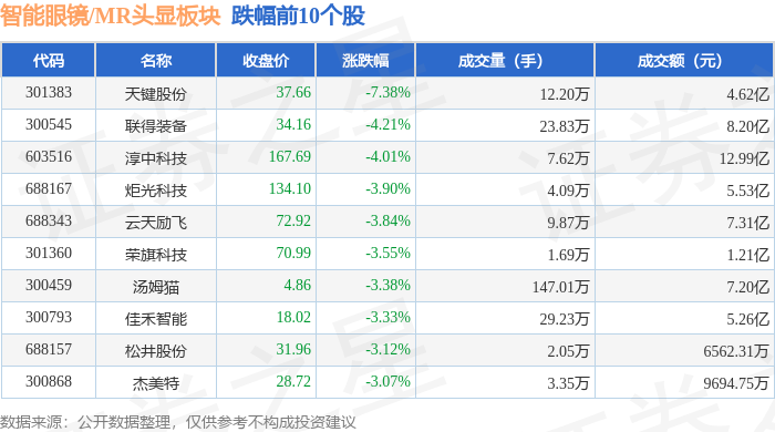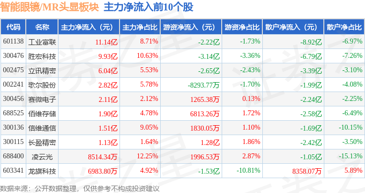 从资金流向上来看,当日智能眼镜/MR头显板块主力资金净流出19.27亿元,游资资金净流入9.0亿元,散户资金净流入10.28亿元。智能眼镜/MR头显板块个股资金流向见下表: