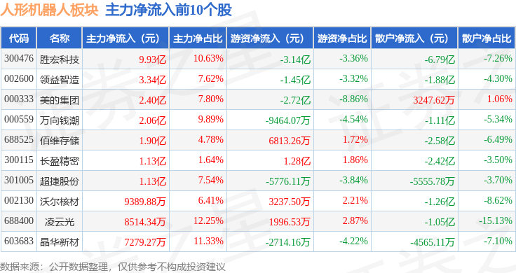 从资金流向上来看,当日人形机器人板块主力资金净流出33.36亿元,游资资金净流入8.36亿元,散户资金净流入24.99亿元。人形机器人板块个股资金流向见下表: