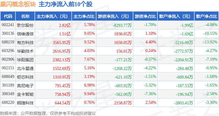 从资金流向上来看,当日星闪概念板块主力资金净流出17.6亿元,游资资金净流入5.76亿元,散户资金净流入11.84亿元。星闪概念板块个股资金流向见下表: