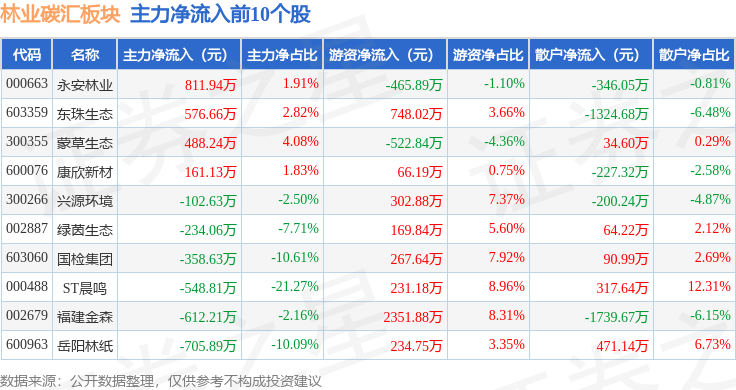 从资金流向上来看,当日林业碳汇板块主力资金净流出2736.53万元,游资资金净流入1660.57万元,散户资金净流入1075.96万元。林业碳汇板块个股资金流向见下表:
