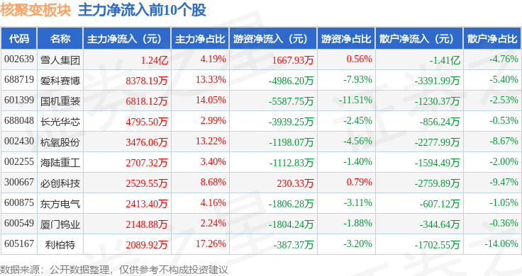 从资金流向上来看,当日核聚变板块主力资金净流出6.58亿元,游资资金净流入745.86万元,散户资金净流入6.51亿元。核聚变板块个股资金流向见下表: