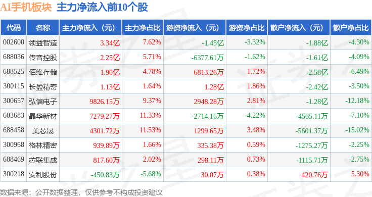 从资金流向上来看,当日AI手机板块主力资金净流出33.91亿元,游资资金净流入13.38亿元,散户资金净流入20.53亿元。AI手机板块个股资金流向见下表: