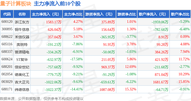 从资金流向上来看,当日量子计算板块主力资金净流出6.97亿元,游资资金净流入2.89亿元,散户资金净流入4.08亿元。量子计算板块个股资金流向见下表: