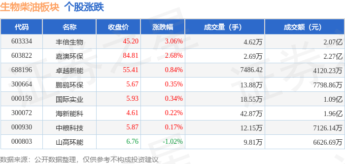 证券之星消息,12月2日生物柴油板块较上一交易日上涨0.65%,丰倍生物领涨。当日上证指数报收于3897.71,下跌0.42%。深证成指报收于13056.7,下跌0.68%。生物柴油板块个股涨跌见下表: