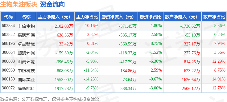 从资金流向上来看,当日生物柴油板块主力资金净流出2060.86万元,游资资金净流出2330.49万元,散户资金净流入4391.35万元。生物柴油板块个股资金流向见下表: