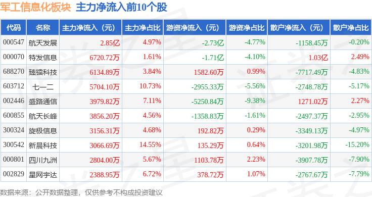 从资金流向上来看,当日军工信息化板块主力资金净流出6.66亿元,游资资金净流出2.2亿元,散户资金净流入8.87亿元。军工信息化板块个股资金流向见下表: