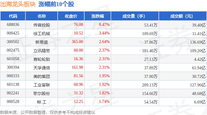 从资金流向上来看,当日出海龙头板块主力资金净流入20.83亿元,游资资金净流出15.12亿元,散户资金净流出5.71亿元。出海龙头板块个股资金流向见下表: