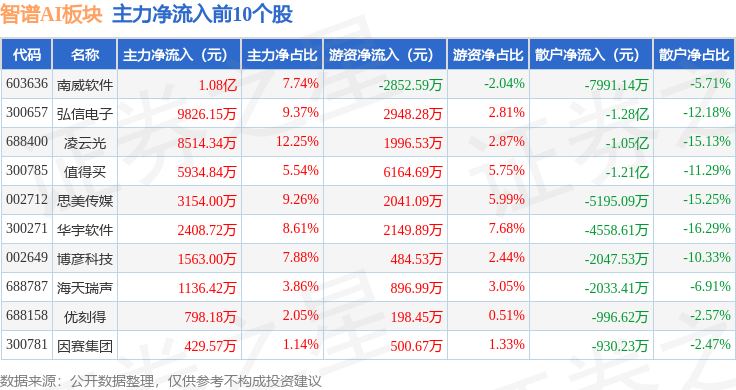 从资金流向上来看,当日智谱AI板块主力资金净流出10.28亿元,游资资金净流入4.23亿元,散户资金净流入6.06亿元。智谱AI板块个股资金流向见下表: