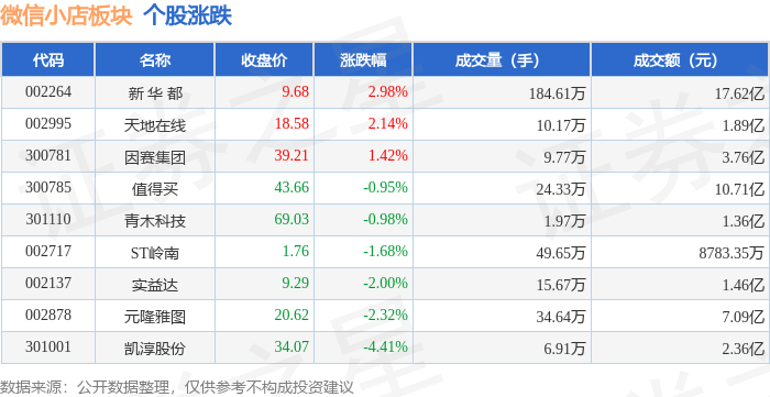 证券之星消息,12月2日微信小店板块较上一交易日下跌0.33%,凯淳股份领跌。当日上证指数报收于3897.71,下跌0.42%。深证成指报收于13056.7,下跌0.68%。微信小店板块个股涨跌见下表: