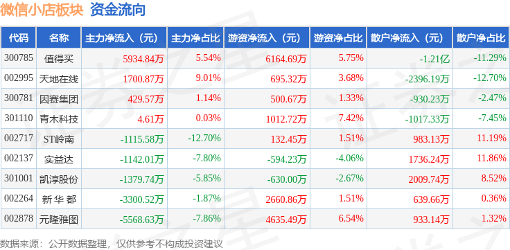 从资金流向上来看,当日微信小店板块主力资金净流出4436.58万元,游资资金净流入1.46亿元,散户资金净流出1.01亿元。微信小店板块个股资金流向见下表: