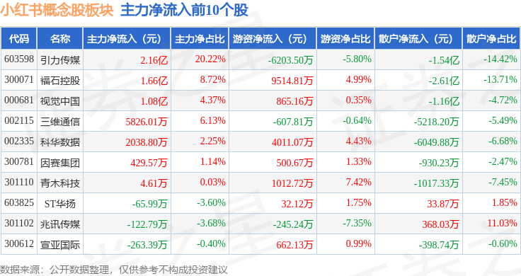 从资金流向上来看,当日小红书概念股板块主力资金净流出5.34亿元,游资资金净流入2.72亿元,散户资金净流入2.63亿元。小红书概念股板块个股资金流向见下表: