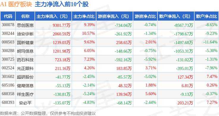 从资金流向上来看,当日AI 医疗板块主力资金净流出6934.85万元,游资资金净流入6895.45万元,散户资金净流入39.4万元。AI 医疗板块个股资金流向见下表: