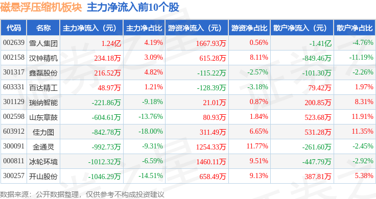 从资金流向上来看,当日磁悬浮压缩机板块主力资金净流出2669.15万元,游资资金净流入5798.46万元,散户资金净流出3129.31万元。磁悬浮压缩机板块个股资金流向见下表: