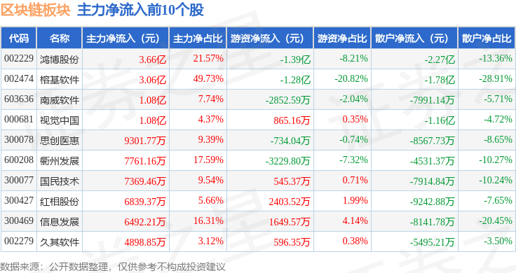 从资金流向上来看,当日区块链板块主力资金净流出79.89亿元,游资资金净流入22.89亿元,散户资金净流入57.01亿元。区块链板块个股资金流向见下表: