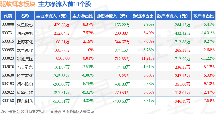 从资金流向上来看,当日驱蚊概念板块主力资金净流出1.3亿元,游资资金净流入3451.01万元,散户资金净流入9561.61万元。驱蚊概念板块个股资金流向见下表: