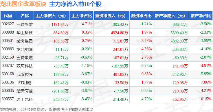 从资金流向上来看,当日湖北国企改革板块主力资金净流出3.22亿元,游资资金净流入1.3亿元,散户资金净流入1.92亿元。湖北国企改革板块个股资金流向见下表: