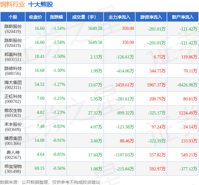 个股表现方面,饲料行业当日领跌股为路斯股份(920419),该股当日报收16.6,下跌1.54%,成交量5650.0,主力资金净流入0.04万元。路斯股份(920419)以下跌1.54%紧随其后,该股当日成交量5650.0,主力资金净流入0.04万元。除此之外,邦基科技(603151)、路德科技(688156)、海大集团(002311)均进入当日熊股之列。具体个股列表见下表: