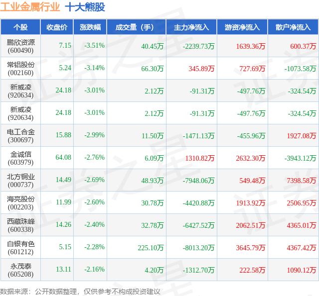 个股表现方面,工业金属行业当日领跌股为鹏欣资源(600490),该股当日报收7.15,下跌3.51%,成交量40.45万,主力资金净流出2239.73万元。常铝股份(002160)以下跌3.14%紧随其后,该股当日成交量66.3万,主力资金净流入345.89万元。除此之外,新威凌(920634)、新威凌(920634)、电工合金(300697)均进入当日熊股之列。具体个股列表见下表:
