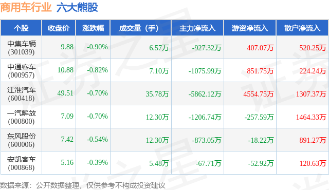 个股表现方面,商用车行业当日领跌股为中集车辆(301039),该股当日报收9.88,下跌0.9%,成交量6.57万,主力资金净流出927.32万元。中通客车(000957)以下跌0.82%紧随其后,该股当日成交量7.1万,主力资金净流出1075.99万元。除此之外,江淮汽车(600418)、一汽解放(000800)、东风股份(600006)均进入当日熊股之列。具体个股列表见下表: