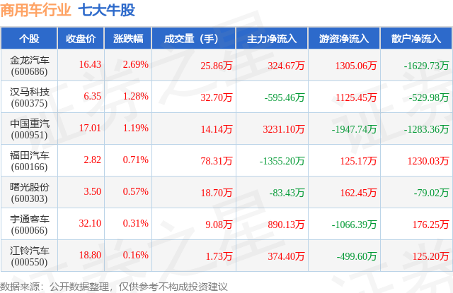 个股表现方面,商用车行业当日领涨股为金龙汽车(600686),该股当日报收16.43,上涨2.69%,成交量25.86万,主力资金净流入324.67万元。汉马科技(600375)以上涨1.28%紧随其后,该股当日成交量32.7万,主力资金净流出595.46万元。除此之外,中国重汽(000951)、福田汽车(600166)、曙光股份(600303)均进入当日牛股之列。具体个股列表见下表: