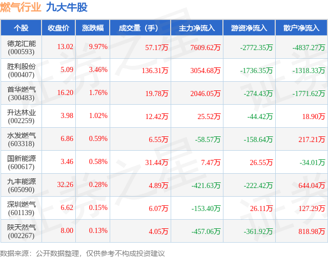 个股表现方面,燃气行业当日领涨股为德龙汇能(000593),该股当日报收13.02,上涨9.97%,成交量57.17万,主力资金净流入7609.62万元。胜利股份(000407)以上涨3.46%紧随其后,该股当日成交量136.31万,主力资金净流入3054.68万元。除此之外,首华燃气(300483)、升达林业(002259)、水发燃气(603318)均进入当日牛股之列。具体个股列表见下表: