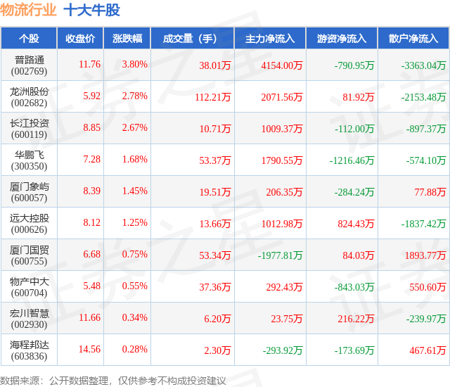 个股表现方面,物流行业当日领涨股为普路通(002769),该股当日报收11.76,上涨3.8%,成交量38.01万,主力资金净流入4154.0万元。龙洲股份(002682)以上涨2.78%紧随其后,该股当日成交量112.21万,主力资金净流入2071.56万元。除此之外,长江投资(600119)、华鹏飞(300350)、厦门象屿(600057)均进入当日牛股之列。具体个股列表见下表: