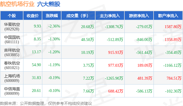 个股表现方面,航空机场行业当日领跌股为华夏航空(002928),该股当日报收9.93,下跌2.36%,成交量20.68万,主力资金净流出1308.76万元。中国国航(601111)以下跌1.3%紧随其后,该股当日成交量48.5万,主力资金净流出512.89万元。除此之外,吉祥航空(603885)、春秋航空(601021)、上海机场(600009)均进入当日熊股之列。具体个股列表见下表: