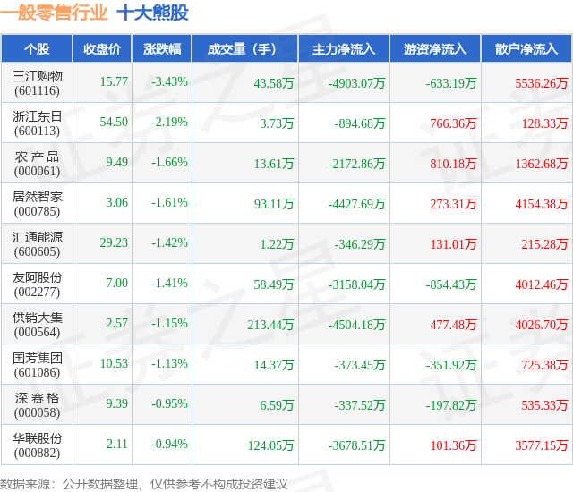 个股表现方面,一般零售行业当日领跌股为三江购物(601116),该股当日报收15.77,下跌3.43%,成交量43.58万,主力资金净流出4903.07万元。浙江东日(600113)以下跌2.19%紧随其后,该股当日成交量3.73万,主力资金净流出894.68万元。除此之外,农 产 品(000061)、居然智家(000785)、汇通能源(600605)均进入当日熊股之列。具体个股列表见下表: