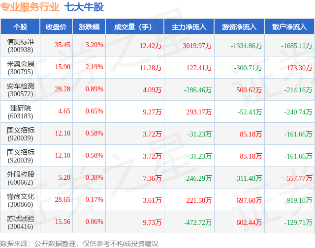 个股表现方面,专业服务行业当日领涨股为信测标准(300938),该股当日报收35.45,上涨3.2%,成交量12.42万,主力资金净流入3019.97万元。米奥会展(300795)以上涨2.19%紧随其后,该股当日成交量11.28万,主力资金净流入127.41万元。除此之外,安车检测(300572)、建研院(603183)、国义招标(920039)均进入当日牛股之列。具体个股列表见下表:
